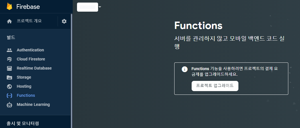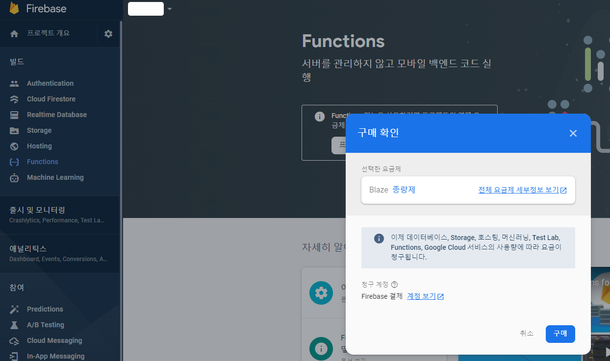 1. Firebase 프로젝트에 Functions기능을 사용하기 위해 요금제를 업그레이드한다 ( 종량제 )