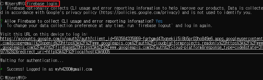 - Firebase CLI(로컬)가 내 Google 계정에 엑세스하려고 합니다 라는 연결요청이 웹으로 온다 ( 자동실행됨 )