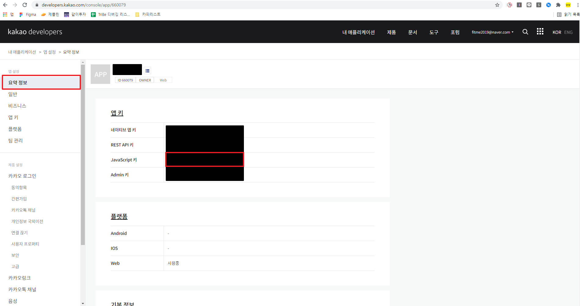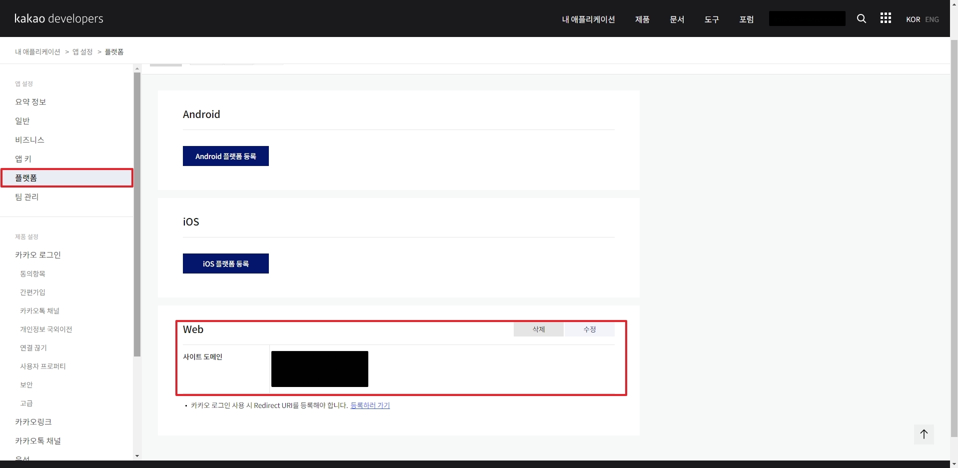 플랫폼 -> 사이트 도메인 등록(http://localhost 가능)