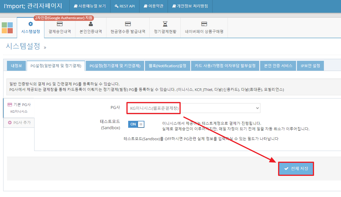 - PG 설정에서 기본 PG 사 KG 이니시스 설정 후 저장