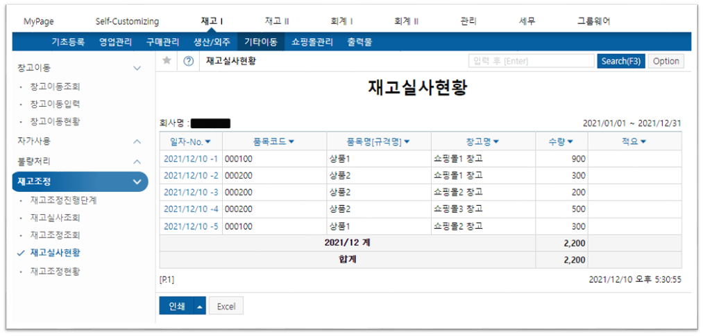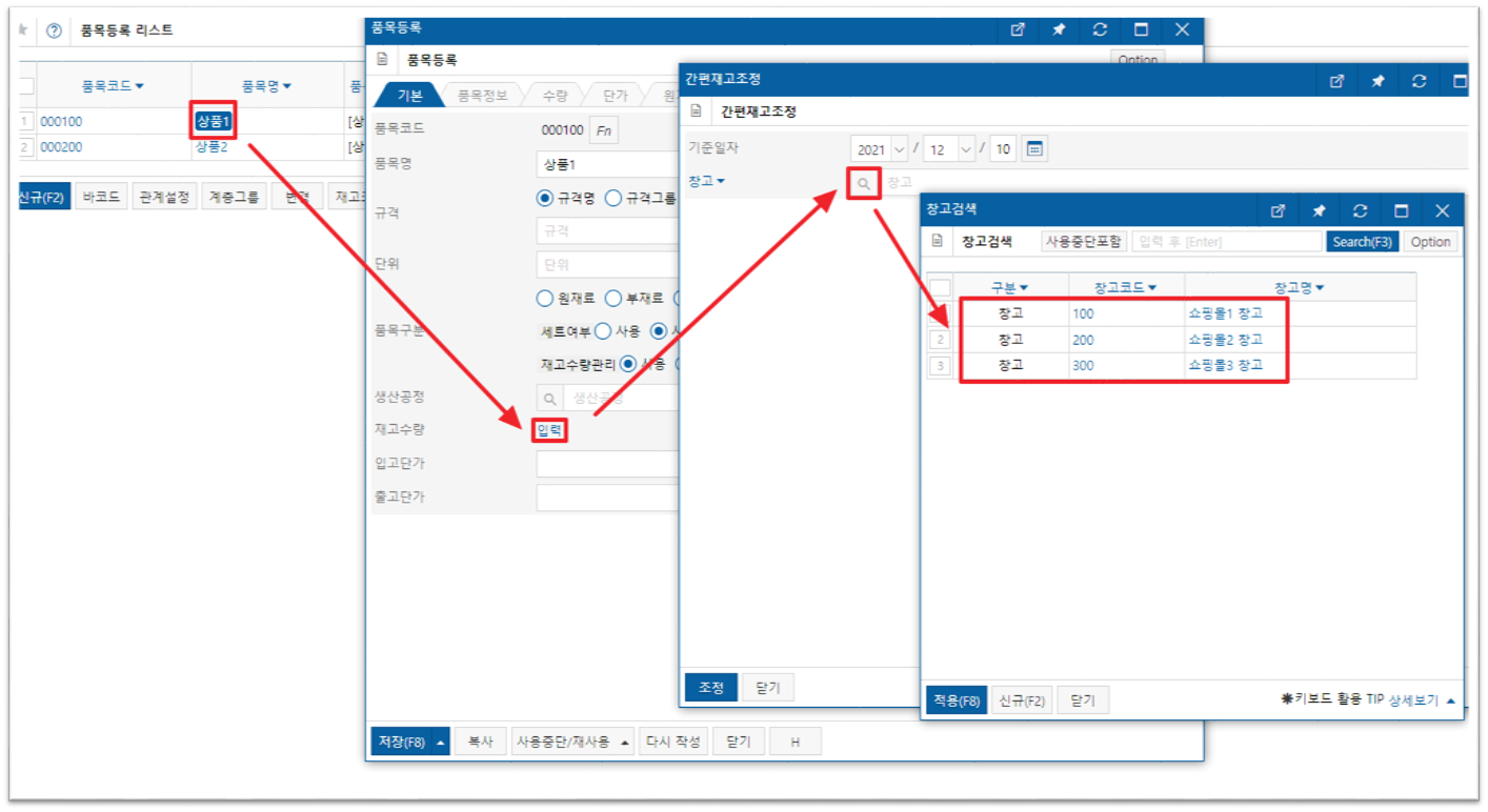 ※ 상품1(품목)이 쇼핑몰1 창고, 쇼핑몰2 창고에 각각 900개, 300개씩 있다고 입력함