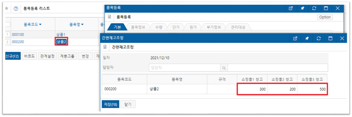 ※ 상품2(품목)가 쇼핑몰1 창고, 쇼핑몰2 창고, 쇼핑몰3 창고에 각각 300개, 200개, 500개 씩 있다고 입력함